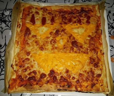 N'ayant pas encore de photos, je vous laisse imaginer ^-^. Dans l'idée, je compte découper à l'emporte-pièce ma pâte à pizza, y mettre la sauce tomate, deux petits ronds fait avec du jambon pour les yeux et des bandes de fromage pour habiller mon monstre ... Un peu style Momie aussi au final