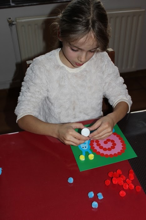 Pour la colle, j'ai préféré le faire moi-même car elle coule vite quand même ... Et au moment de coller, elle a bien reconnu les pompons de la bonne couleur à mettre sur son dessin.