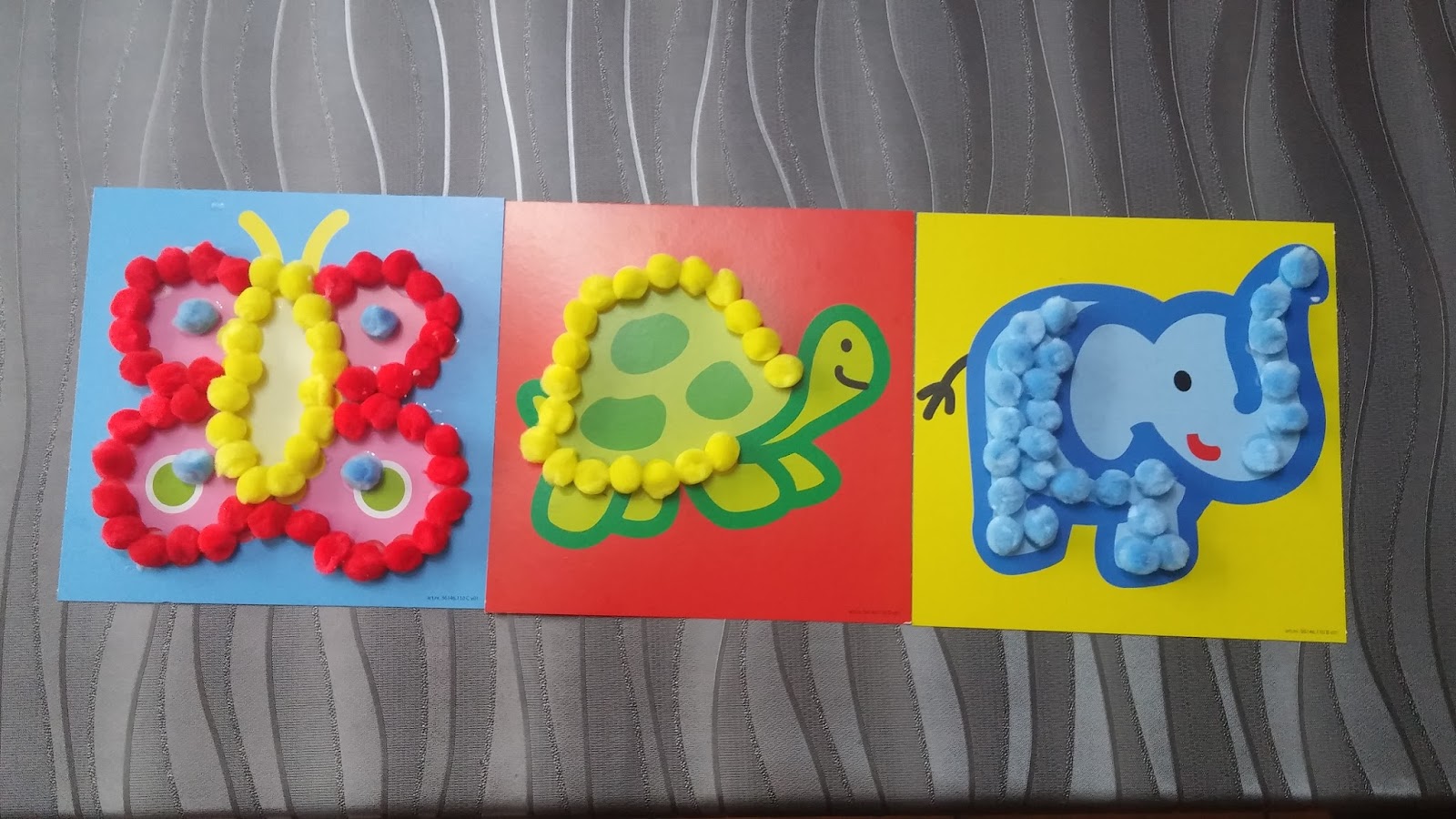 - 4 dessins cartonnés : un éléphant, un escargot, un papillon et une tortue dont la difficulté varie de dessin en dessin ! La tortue a juste une couleurs de pompon alors que le papillon a les 3 couleurs.
