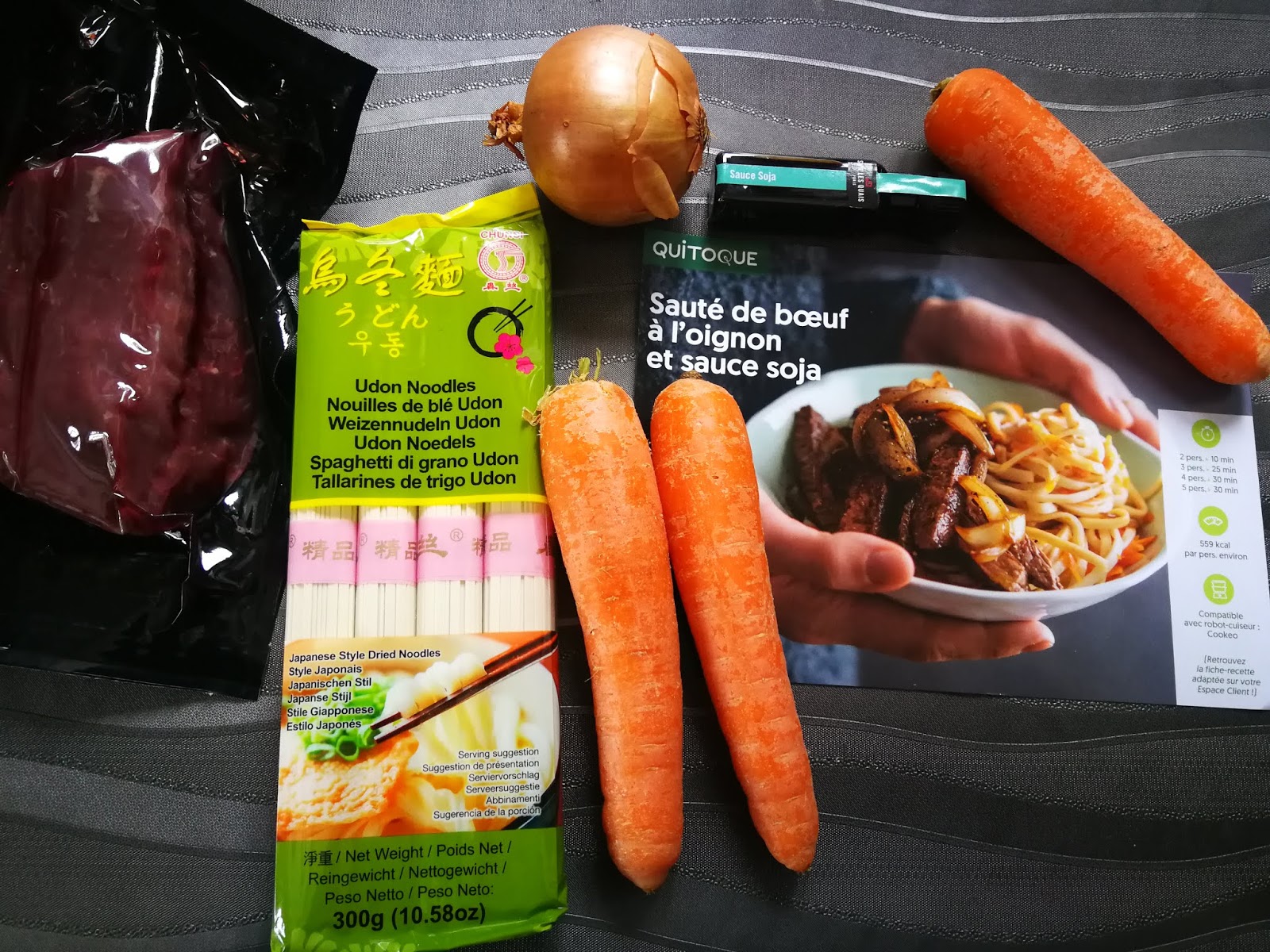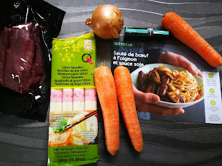 - coupez le boeuf en lanières de 1 à 2 cm et faire revenir les morceaux 30 secondes à 1 minutes avec l'oignon.
